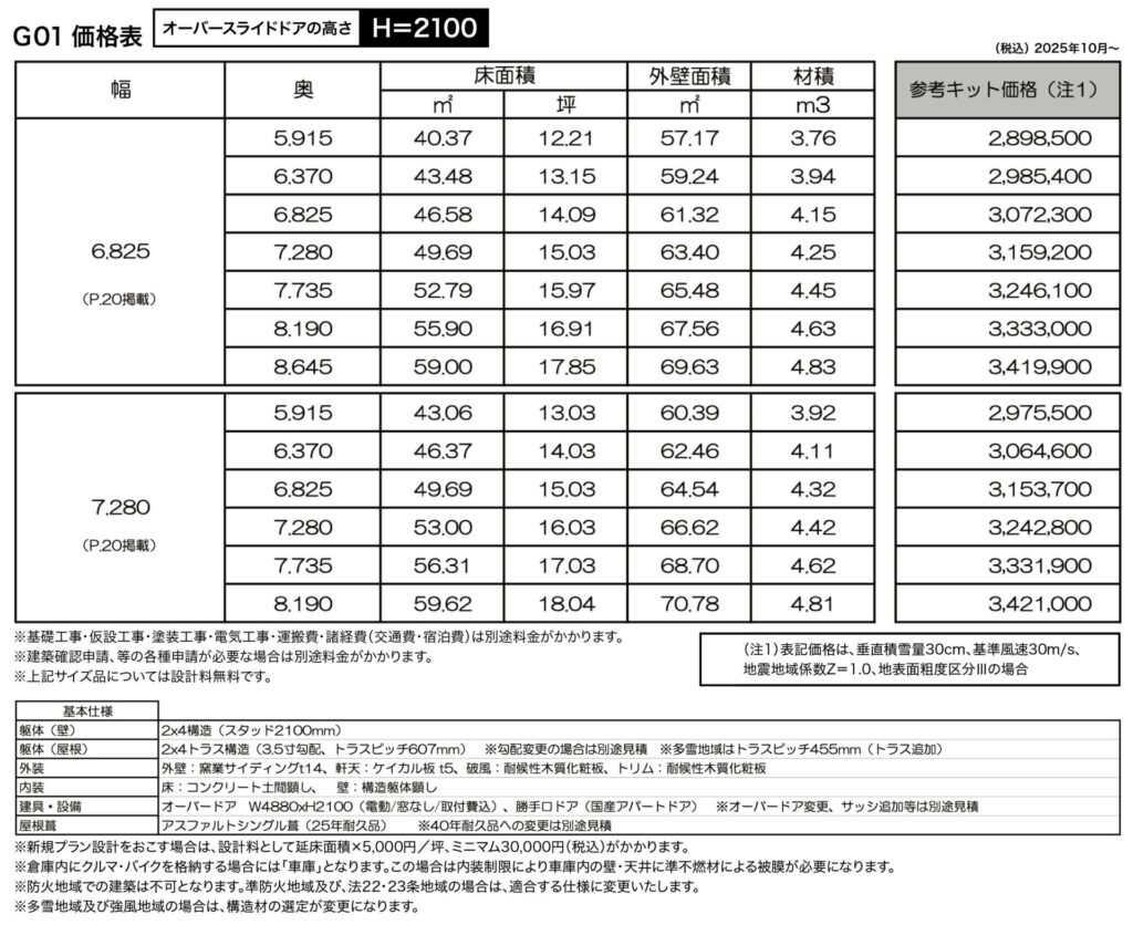 G01価格表・オーバースライドドア高さ=2100