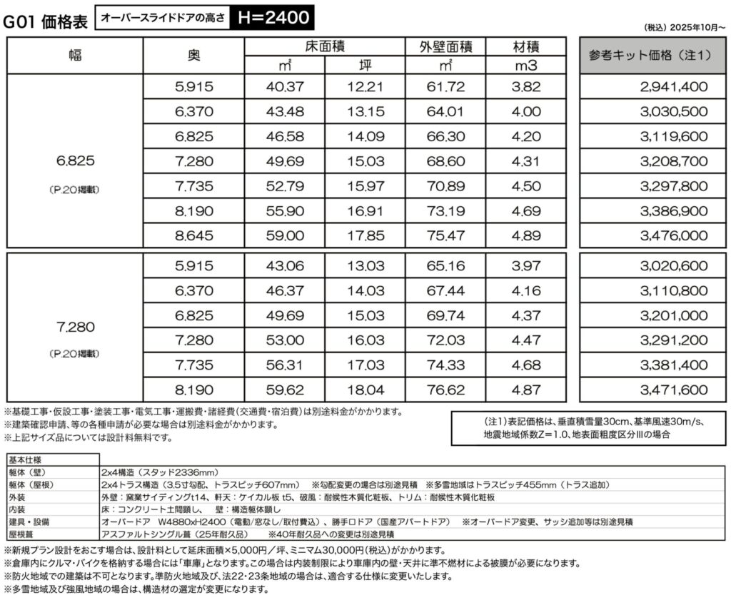G01価格表・オーバースライドドア高さ=2400